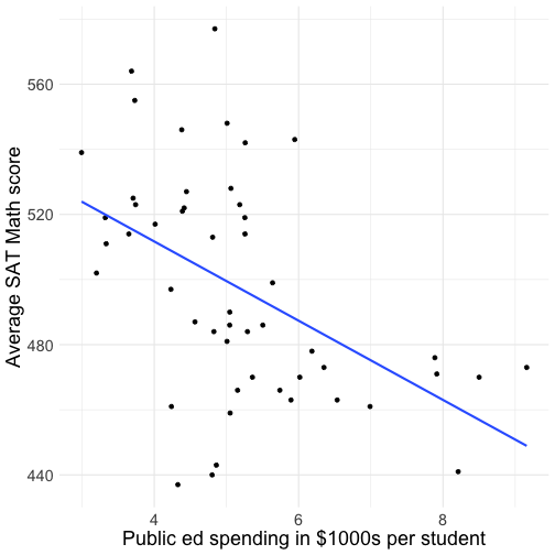 class: center, middle, inverse, title-slide .title[ # PADP 7120 Data Applications in PA ] .subtitle[ ## Simple & Multiple Linear Regression ] .author[ ### Alex Combs ] .institute[ ### UGA | SPIA | PADP ] .date[ ### Last updated: February 19, 2026 ] --- # Outline - Understand the purpose of regression and its relevance to making decisions - Interpret regression coefficients - Assess goodness-of-fit for one model or between several competing models - Understand what it means to control for other variables --- # Example Data ``` r glimpse(States) ``` ``` ## Rows: 51 ## Columns: 7 ## $ region <fct> ESC, PAC, MTN, WSC, PAC, MTN, NE, SA, SA, SA, SA, PAC, MTN, EN… ## $ pop <int> 4041, 550, 3665, 2351, 29760, 3294, 3287, 666, 607, 12938, 647… ## $ SATV <int> 470, 438, 445, 470, 419, 456, 430, 433, 409, 418, 401, 404, 46… ## $ SATM <int> 514, 476, 497, 511, 484, 513, 471, 470, 441, 466, 443, 481, 50… ## $ percent <int> 8, 42, 25, 6, 45, 28, 74, 58, 68, 44, 57, 52, 17, 16, 54, 5, 1… ## $ dollars <dbl> 3.648, 7.887, 4.231, 3.334, 4.826, 4.809, 7.914, 6.016, 8.210,… ## $ pay <int> 27, 43, 30, 23, 39, 31, 43, 35, 39, 30, 29, 32, 25, 34, 32, 28… ``` --- # Correlation coefficients ``` r select(States, -region) %>% cor() ``` ``` ## pop SATV SATM percent dollars pay ## pop 1.0000000 -0.3381028 -0.2300418 0.2100687 0.1436745 0.3677244 ## SATV -0.3381028 1.0000000 0.9620359 -0.8627954 -0.5268313 -0.5559238 ## SATM -0.2300418 0.9620359 1.0000000 -0.8581495 -0.4844477 -0.4853306 ## percent 0.2100687 -0.8627954 -0.8581495 1.0000000 0.7111474 0.6630098 ## dollars 0.1436745 -0.5268313 -0.4844477 0.7111474 1.0000000 0.8476737 ## pay 0.3677244 -0.5559238 -0.4853306 0.6630098 0.8476737 1.0000000 ``` --- # Visualizing correlation ``` r ggplot(States, aes(x = dollars, y = SATM)) + geom_point() + labs(x = 'Public ed spending in $1000s per student', y = 'Average SAT Math score') + theme(text=element_text(size=18)) ``` <img src="Regression_files/figure-html/unnamed-chunk-4-1.png" alt="" style="display: block; margin: auto;" /> --- # Correlation conclusions <img src="Regression_files/figure-html/unnamed-chunk-5-1.png" alt="" style="display: block; margin: auto;" /> - States that spend more on public education tend to have lower average SAT Math scores among its graduating high school students - The strength of the relationship is moderate at -0.48 --- # Basic purpose of regression .pull-left[ <!-- --> ] .pull-right[ - Measures direction, strength, and magnitude of association - Draws line of **best fit** through paired x-y data points - Slope of line tells us the **average, predicted change in y given a change in x** - Or, at any value of x, the **predicted value of y** ] --- # Basic purpose of regression - Regression is a way of modeling an outcome `\(y\)` as a function of one or more explanatory variables `\(x\)`. - Regression can be used to **explain** an outcome or **predict** an outcome, or both. --- # Adding a regression line ``` r ggplot(States, aes(x = dollars, y = SATM)) + geom_point() + * geom_smooth(method = 'lm', se = FALSE) + labs(x = 'Public ed spending in $1000s per student', y = 'Average SAT Math score') ``` <img src="Regression_files/figure-html/unnamed-chunk-7-1.png" alt="" style="display: block; margin: auto;" /> --- # Equation of a line `$$y = 600 - 20x$$` - If `\(x=5\)`, `\(y=?\)` - If `\(x=6\)`, `\(y=?\)` -- - If `\(x\)` increases from 5 to 6, by how much does `\(y\)` change? - If `\(x\)` increases from 2 to 5, by how much does `\(y\)` change? --- # Simple regression model (population) `$$y=\beta_0+\beta_1x+\epsilon$$` - Which represents the dependent variable? - Which represents the independent variable? - Which represents the unknown population parameters? - Which represents statistical noise? --- # Simple regression model (sample) `$$\hat{y}=b_0+b_1x$$` - Which represents the predicted outcome? - Which represents the estimates? --- # Applied example - Suppose we want to model average SAT math scores, `SATM`, in a state as a function of its spending on public education in **$1000s per student**, `dollars` `$$SATM=\beta_0+\beta_1Dollars+\epsilon$$` -- <table> <thead> <tr> <th style="text-align:left;"> term </th> <th style="text-align:right;"> estimate </th> <th style="text-align:right;"> std_error </th> <th style="text-align:right;"> statistic </th> <th style="text-align:right;"> p_value </th> <th style="text-align:right;"> lower_ci </th> <th style="text-align:right;"> upper_ci </th> </tr> </thead> <tbody> <tr> <td style="text-align:left;"> intercept </td> <td style="text-align:right;"> 560.374 </td> <td style="text-align:right;"> 16.801 </td> <td style="text-align:right;"> 33.353 </td> <td style="text-align:right;"> 0 </td> <td style="text-align:right;"> 526.610 </td> <td style="text-align:right;"> 594.137 </td> </tr> <tr> <td style="text-align:left;"> dollars </td> <td style="text-align:right;"> -12.169 </td> <td style="text-align:right;"> 3.139 </td> <td style="text-align:right;"> -3.876 </td> <td style="text-align:right;"> 0 </td> <td style="text-align:right;"> -18.478 </td> <td style="text-align:right;"> -5.860 </td> </tr> </tbody> </table> -- - Replacing parameters with estimates `$$\hat{SATM} = 560 - 12.17 \times Dollars$$` --- # Example: Reporting results `$$\hat{SATM} = 560 - 12.17 \times Dollars$$` On average, a one thousand dollar increase in state spending on public education per student is associated with a 12 point decline in average SAT math scores. -- - What is the predicted increase in `SATM` if a state increased `Dollars` by $2,500 per student? -- - What is the predicted `SATM` in a state that spends $5,000 per student? -- - What is the predicted `SATM` in a state that spends $0 per student? --- # Another example - Now `SATM` as a function of the percent of graduating high school students who take the SAT, `percent` `$$SATM=\beta_0+\beta_1Percent+\epsilon$$` <table> <thead> <tr> <th style="text-align:left;"> term </th> <th style="text-align:right;"> estimate </th> <